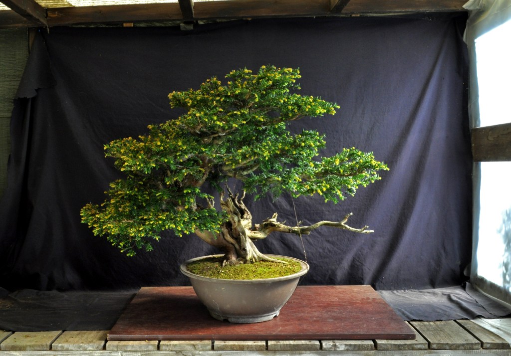 The year is 1990 and I was doing Bonsai for not more than half a year or so when I visited the “China Bonsai centre” in Schiedam (Holland). This giant greenhouse was filled from top to bottom with many commercial Bonsai! But there were always a few better ones brought back from their trips to China! And one of them was the tucked-away big Chinese Pinus parviflora from this story! It cost us a whopping 1000 Gulden (450 Euro) and that was a lot of money those days and still is! Below: 7 years later and the year is 1997 when my Pine was shown in the third edition of the famous GINKGO AWARDS in Belgium.