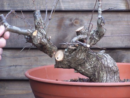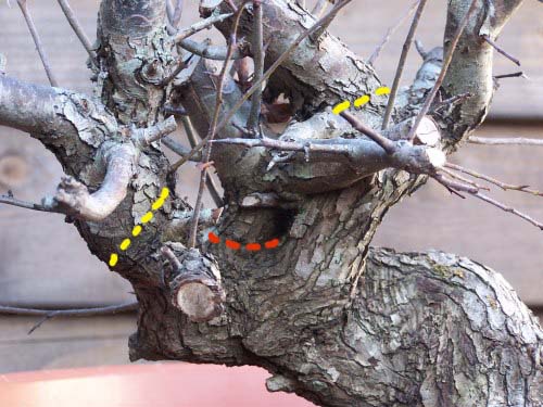 After all the wounds were cut back sufficiently, they were sealed with cut paste. The large wound on the left of the tree (middle picture) is cut back to about 2,5 cm/1 inch of the truck. In the future, this stump will be worked into a small Jin + Shari or maybe only a Shari? But this work is left for the future! Because doing it now and then leaving such a large open scare, right on the trunk line, could cause die back in the trunk! Every large wound that is left exposed to the elements; will dry/die back, interrupting the sap flow between roots and branches! Which could kill your branches and roots or even your whole tree! Because I left the bark on this little stump, it will stay alive for a long time, preventing the possibility of trunk die/dry back! The tree will probably even throw out a bunch of strong shouts along the rim of the wound, the tree’s own bandage! A sign the tree’s sap stream is pumping along the wound. Only after the tree has shown these signs of full recovery, will I start to take that stump away, bit by bit.
