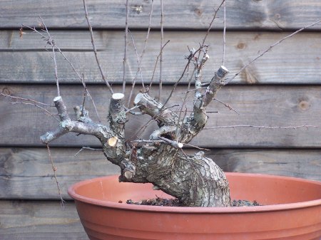 She grew on a steep mountainside in soil, consisting of almost nothing else than small rocks and gravel, from which I could almost entirely collect her with nothing more than my bare hands (that looked and felt like they had been looking for a pin in a pin stack)! Never the less, she had managed to grow surprisingly good roots, with a lot of small feeder roots growing close the base of the trunk. So I could cut the to larch roots back without causing to much harm to the health of the tree. From experience, I know that next Spring the tree will react to this hard root and branch cut back, with much growth of small feeder roots, that will secure the health of the tree, during this time it is recovering from the stress caused by collecting it and potting it. As soon as the tree was lifted from the ground the bare roots were wrapped in wet sphagnum moss and then put into a plastic bin bag that was tightly wrapped with plastic tape. Early next day at the venue in “BURRS” my good friend Terry Foster helped me to plant the tree in a plastic training pot, making sure that the tree was firmly secured to the bottom with aluminium wires. The Hawthorn stayed in Tony’s care during that winter. He placed the tree in his greenhouse on a heating bed. In February the following year, Tony came, just like me and many others, to the “Noelanders trophy” in Belgium to show his Bonsai and to meet up with all our bonsai friends from all over Europe that come there every year as well. He kindly brought along my Hawthorns I collected and so after the show they finally came home with me to my little garden in Holland. The Hawthorns ( I collected two) were placed in my greenhouse for protection during the rest of that Winter. In Spring I was delighted to see that the trees literally burst out with new buds all over. I removed all the buds that were unnecessary for my design from the trunk, simply by rubbing them off with my fingers. Leaving unwanted buds to grow will take the strength away from other more important buds and will leave unwanted scares in your trunk. The tree was allowed to grow freely the next growing season, in a semi-shaded place in my garden. In the next picture from August that year, you can see that she was doing really well and I knew then that I could safely give it here first styling at the end of the winter before the buds start swelling.