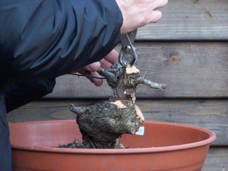 A large branch cutter, like I use here, is a priceless tool for this kind of work! It makes a clean cut in one go, without placing to much sideways force on the tree and roots, like a saw or power tool does. No matter how good you think you hold the tree in place!