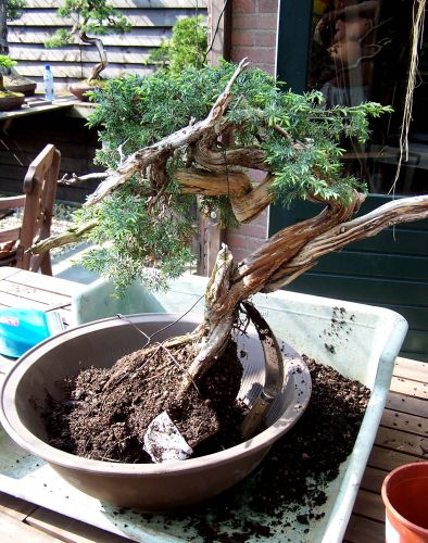 I met Henk Steneker, the organizer of this workshop, during the Masterclass I did last year. There he asked if I would like to give a workshop in the following year at his relative new Bonsai shop “Iss Hogai” that is based in his new house in Emmen (Holland). Well, of course, I said yes and last weekend it was time for me to make the 2 and a half hour long trip to the North East of Holland. I made it in one go and arrived right in time for a warm welcome by Henk and a cup of coffee with cake! He showed me around his large garden that is being converted to a Bonsai garden with benches for his and his club members Bonsai and a large area to work. There is a nice indoor section in his garden to work when it is cold and raining or as in this case, rather hot! His club consists of a small but very enthusiastic group of Bonsai junkies, that had a great time during this sunny day! It is good to know, that there are so many people in Holland that are willing to make that extra effort to progress in their hobby! Because I know that improvement through working on Bonsai, will make this magnificent hobby, even more, enjoyable for them!